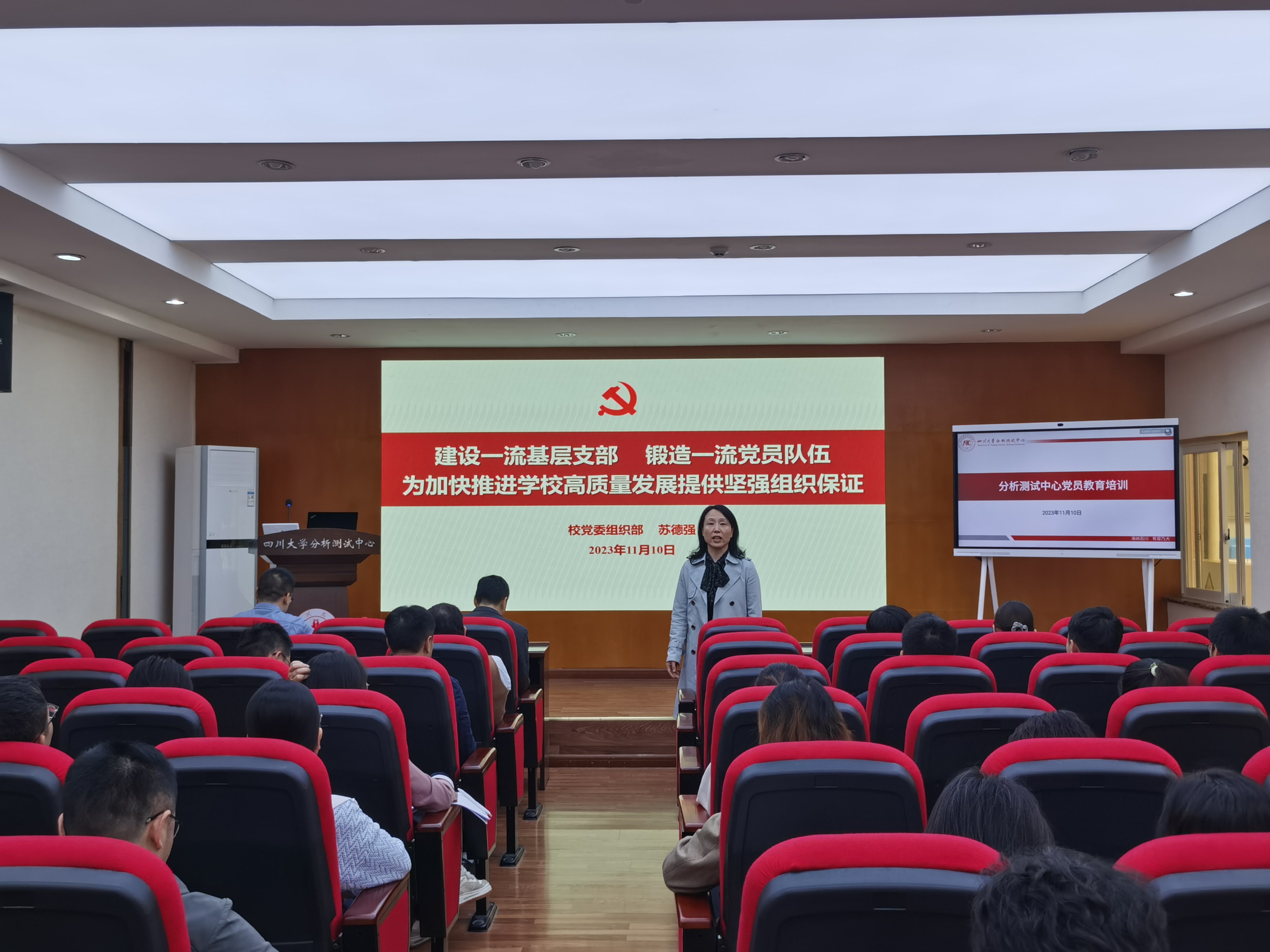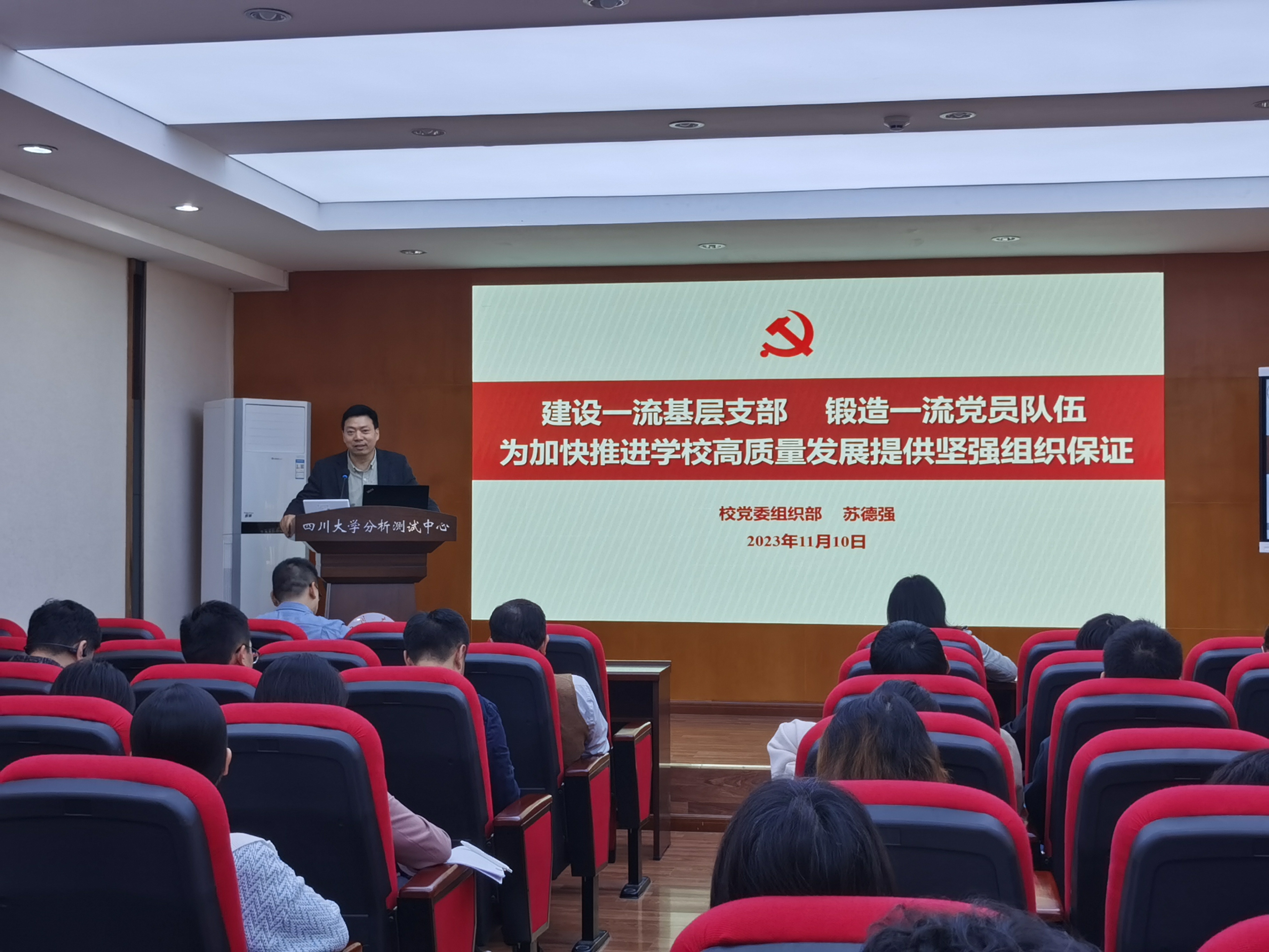 2023年11月10日下午,分析测试中心在中心333会议室开展了党员教育专题培训,特邀校党委组织部副部长苏德强主讲,中心党总支书记吴兰主持,中心全体师生党员参加了会议。