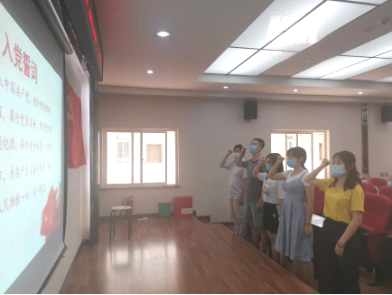 接着进入庄严的时刻,面对党旗,侯贤灯同志领誓,带领新党员郑重入党宣誓。