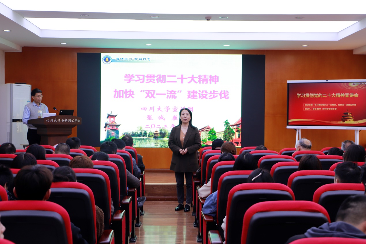 3月24日下午,学校分析测试中心在本单位333会议室举行了“党的二十大精神宣讲报告会”,特邀学校宣讲团专家张诚教授主讲,中心党总支书记吴兰主持,中心全体在职教职工党员和学生党员以及离退休教职工党员代表参加了会议。