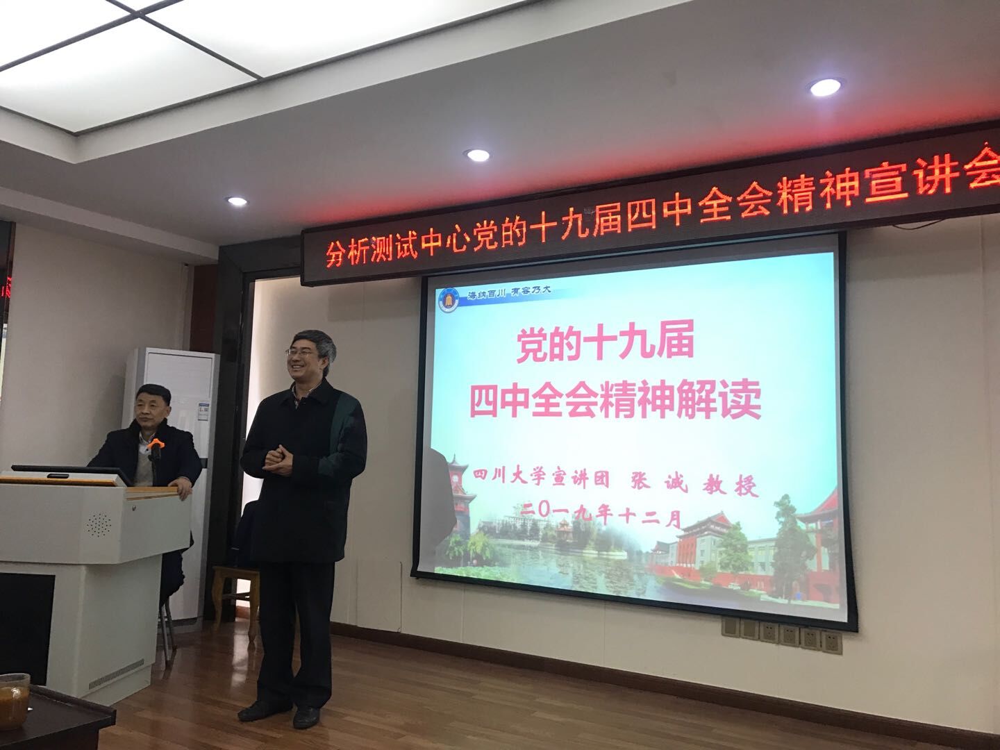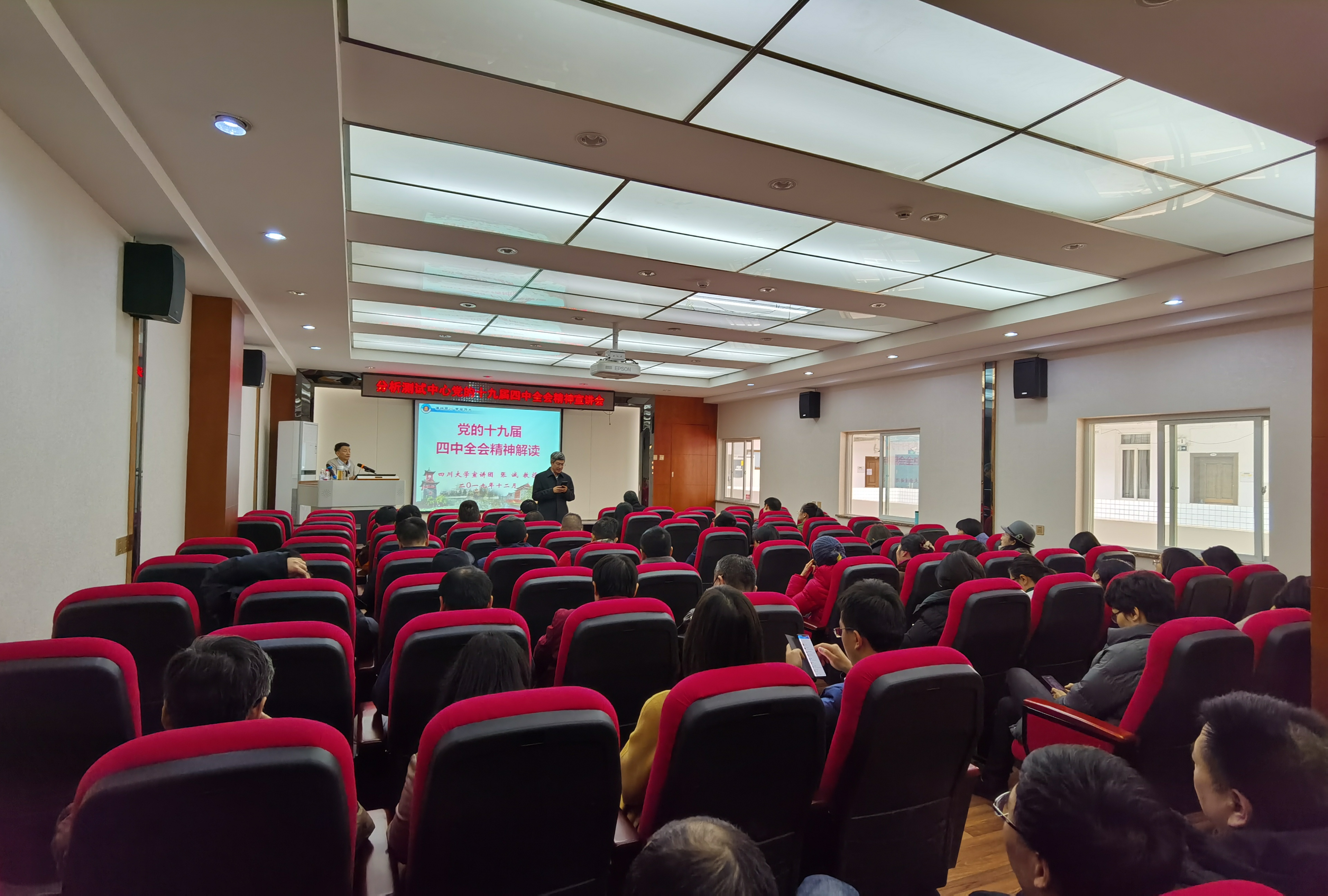 首先张诚同志以“党的十九届四中全会精神解读”为题,从“全会的里程碑意义、全会的主要精神、全会精神的学习贯彻”三个方面,对全会精神进行了全面系统的宣讲。他还紧密联系学校和分析测试中心工作实际,提出了深入学习贯彻全会精神的建议意见。中心党总支书记侯贤灯教授代表中心与会教师对张诚同志的精彩宣讲表示衷心感谢,并着重对本单位深入学习贯彻全会精神提出了进一步的明确要求。
