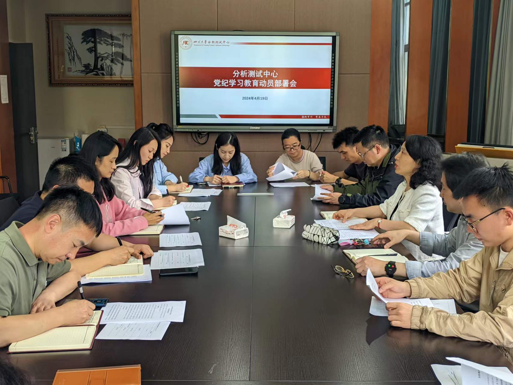 4月19日,分析测试中心在201会议室召开党纪学习教育动员部署会。中心党政领导班子、党总支委员、党支部书记、党支部委员参加会议。