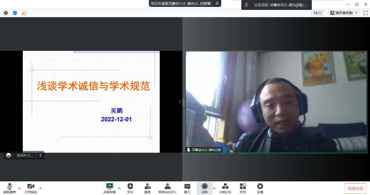 为进一步培育和践行社会主义核心价值观,加强诚信和学术道德教育,营造良好的学习科研氛围。2022年12月1日下午,分析测试中心邀请优秀青年基金获得者吴鹏研究员为全体研究生作诚信教专题讲座。