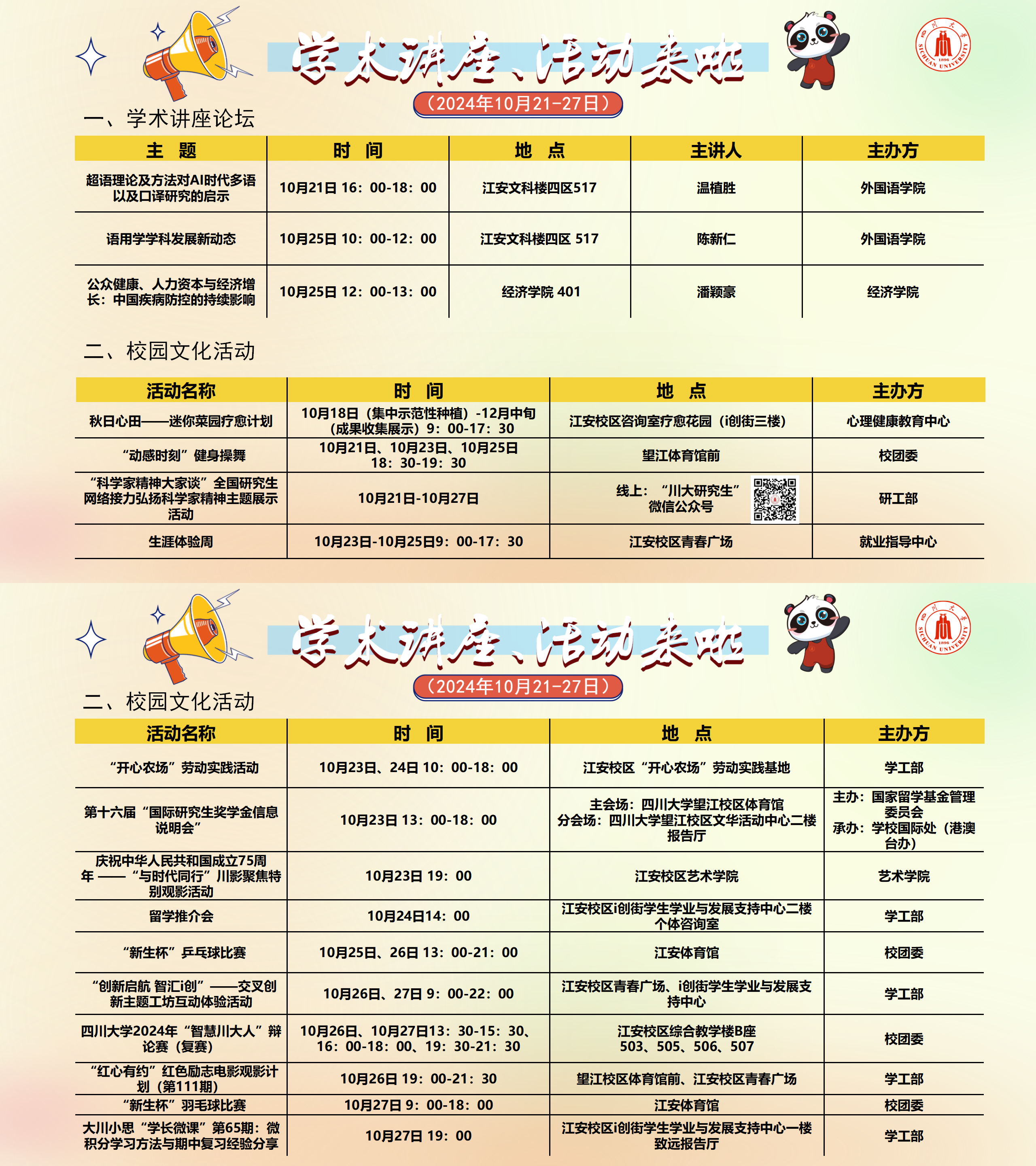 yl23455永利集团2024年10月21日-27日学术讲座论坛及校园文化活动预告